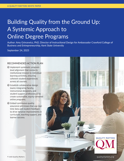 This white paper examines how institutions can design sustainable, high-quality online degree programs through systemic program-level alignment rather than isolated course development. It presents a holistic framework built on four integrated pillars: Program Design, Teaching Support, Learner Support, and Learner Success. It demonstrates how these elements work together to create coherent student experiences from enrollment through graduation. The paper covers strategic curriculum alignment with institutional mission, collaborative faculty development models, embedded support systems that foster belonging, and comprehensive approaches to measuring student success beyond traditional metrics.